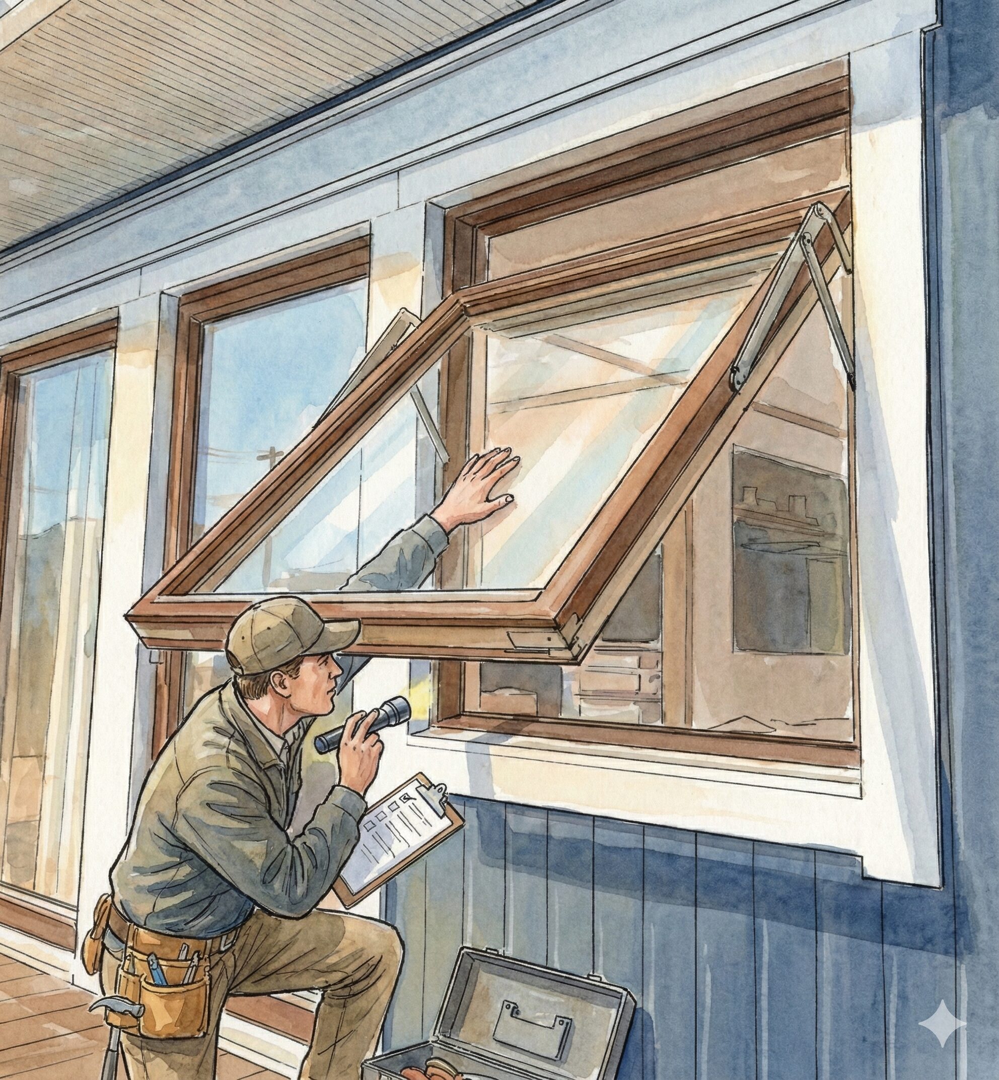 - 回転窓の動き: 180度回転する窓の動きがスムーズかを確認します。動きが硬い箇所には、その場で専用の潤滑スプレー(シリコン系やドライファストルブ等)を可動金物に塗布してくれます。